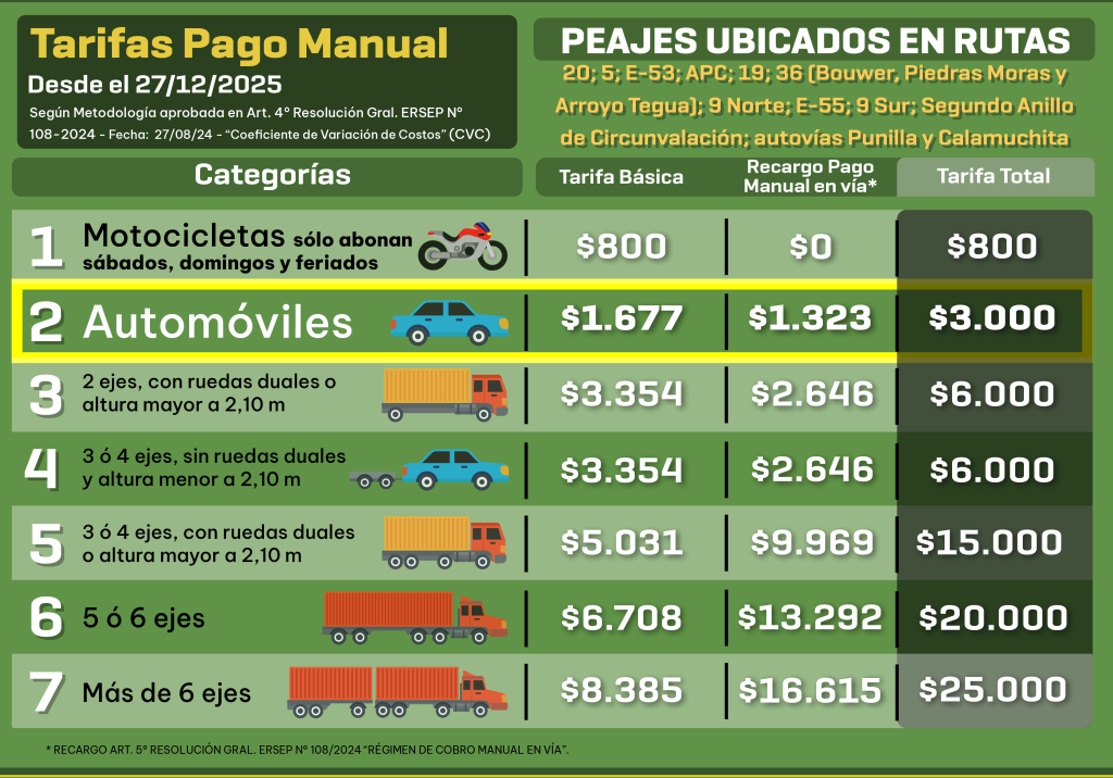 La empresa Caminos de las Sierras informa que a partir de las 0 horas del sábado 27 de diciembre entrará en vigencia un nuevo cuadro tarifario en las rutas de la Red de Accesos a Córdoba (RAC).